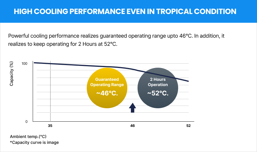 Powerful cooling performance realizes guaranteed operating range upto 46°C. In addition, it realizes to keep operating for 2 Hours at 52°C.