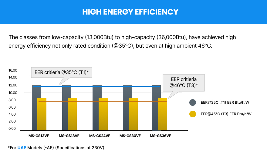 The classes from low-capacity (13,000Btu) to high-capacity (36,000Btu), have achieved high energy efficiency not only rated condition (@35°C), but even at high ambient 46°C.