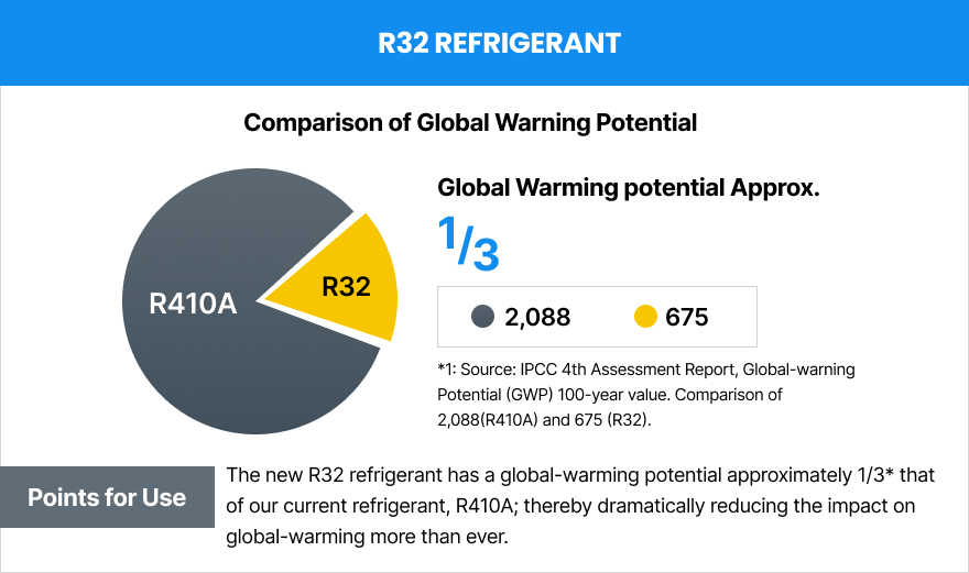 The new R32 refrigerant has a global-warming potential approximately 1/3* that of our current refrigerant, R410A; thereby dramatically reducing the impact on global-warming more than ever.