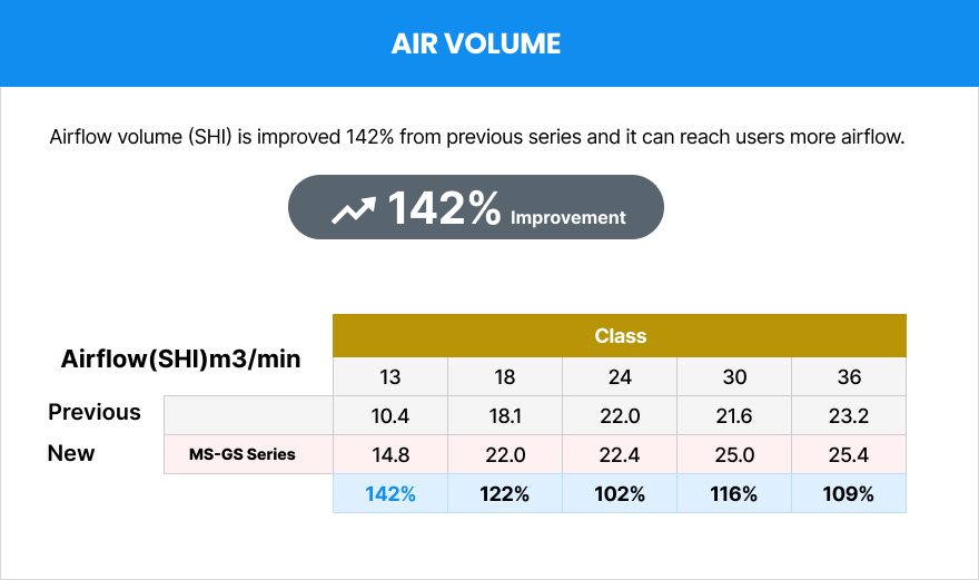 Airflow volume (SHI) is improved 142% from previous series and it can reach users more airflow.